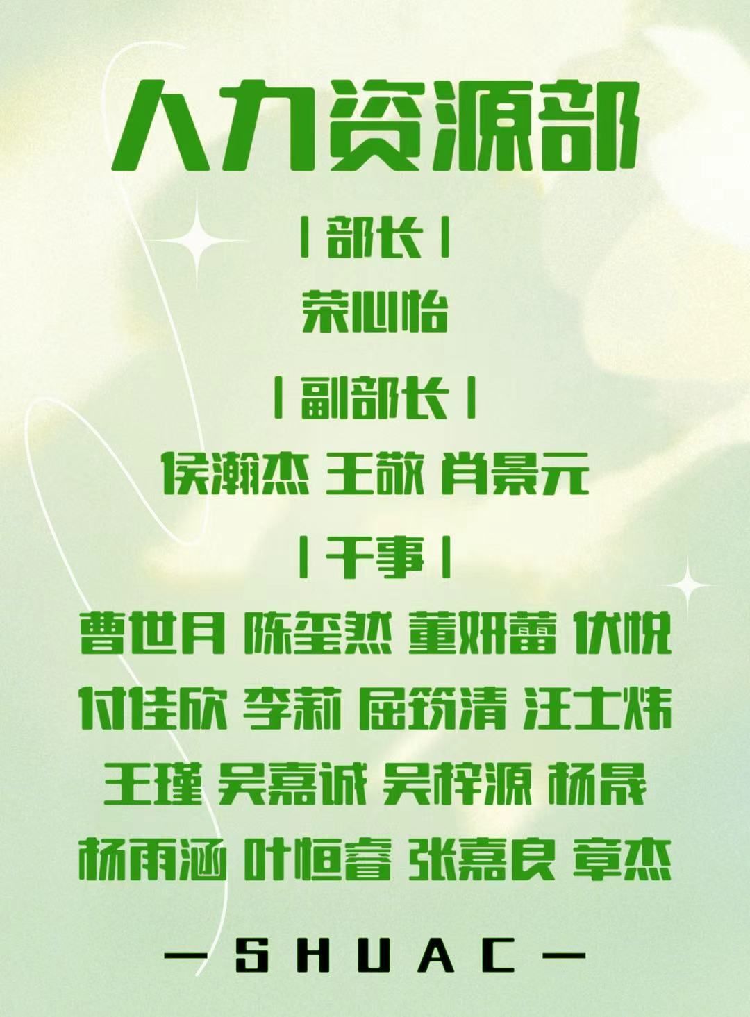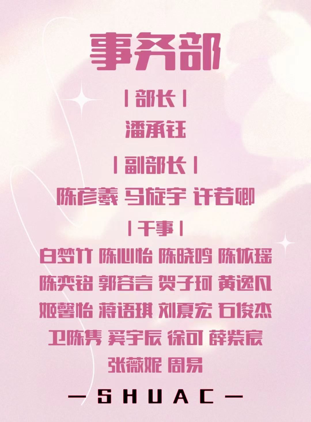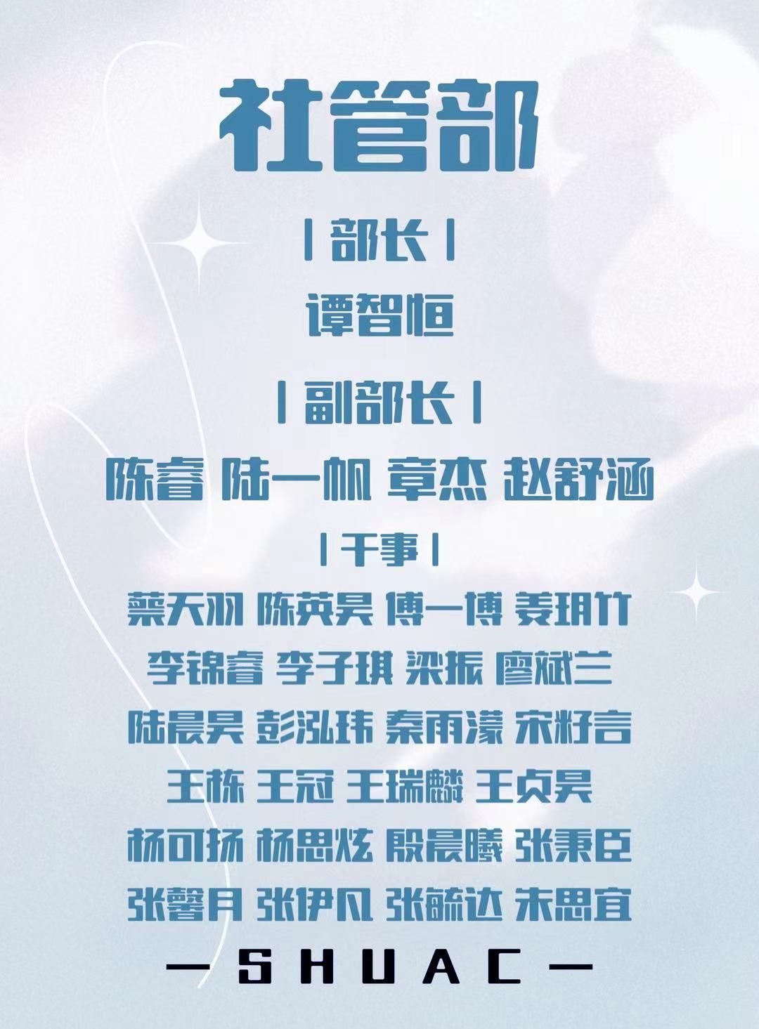 经过充分考核与审核,现正式宣布以下同学被录用为2025-2026学年上海大学学生社团发展指导中心各部门的干事。同时,恭喜各位部长顺利通过三个月的试用期。具体名单如下(按姓名音序排列):