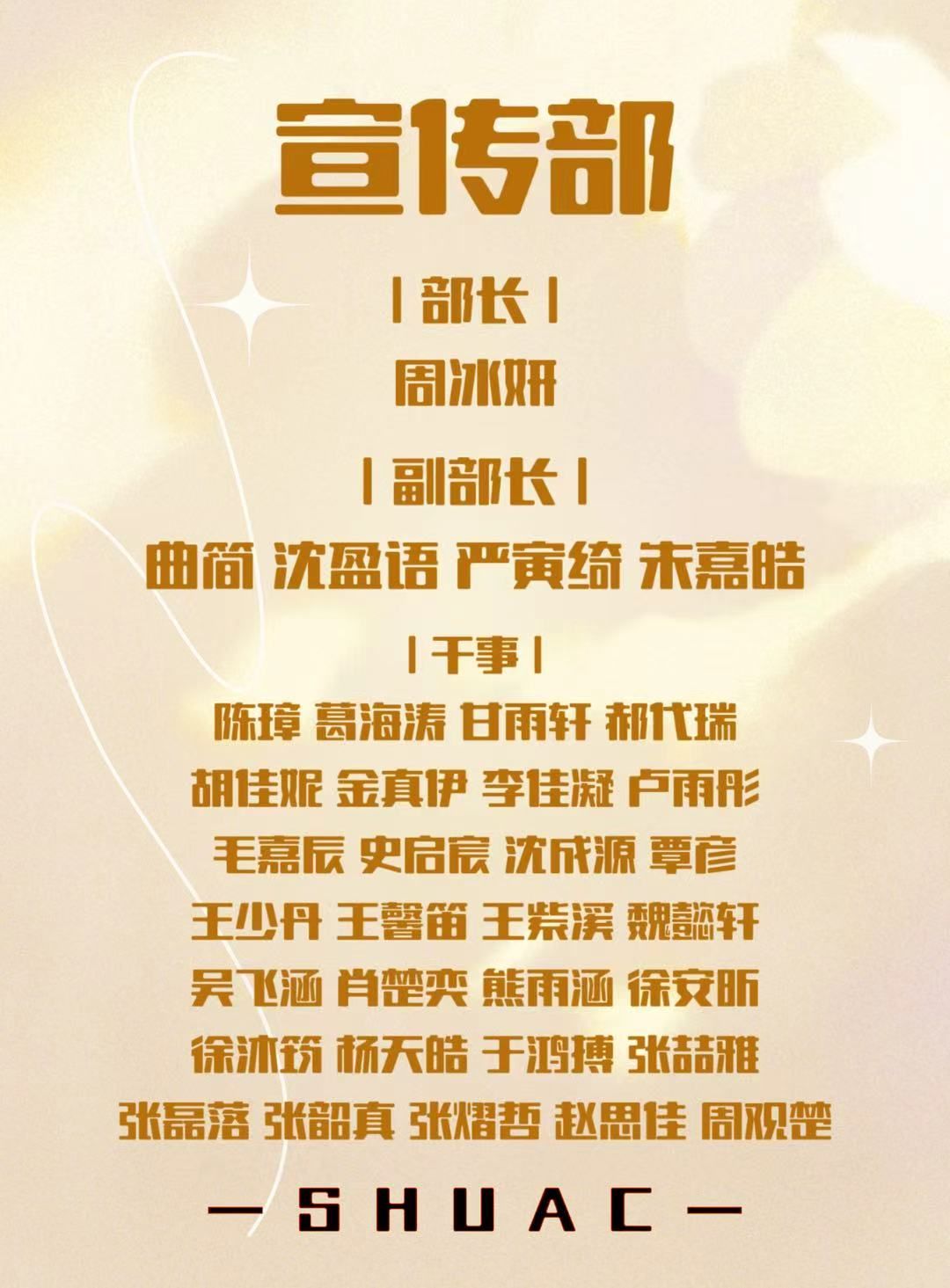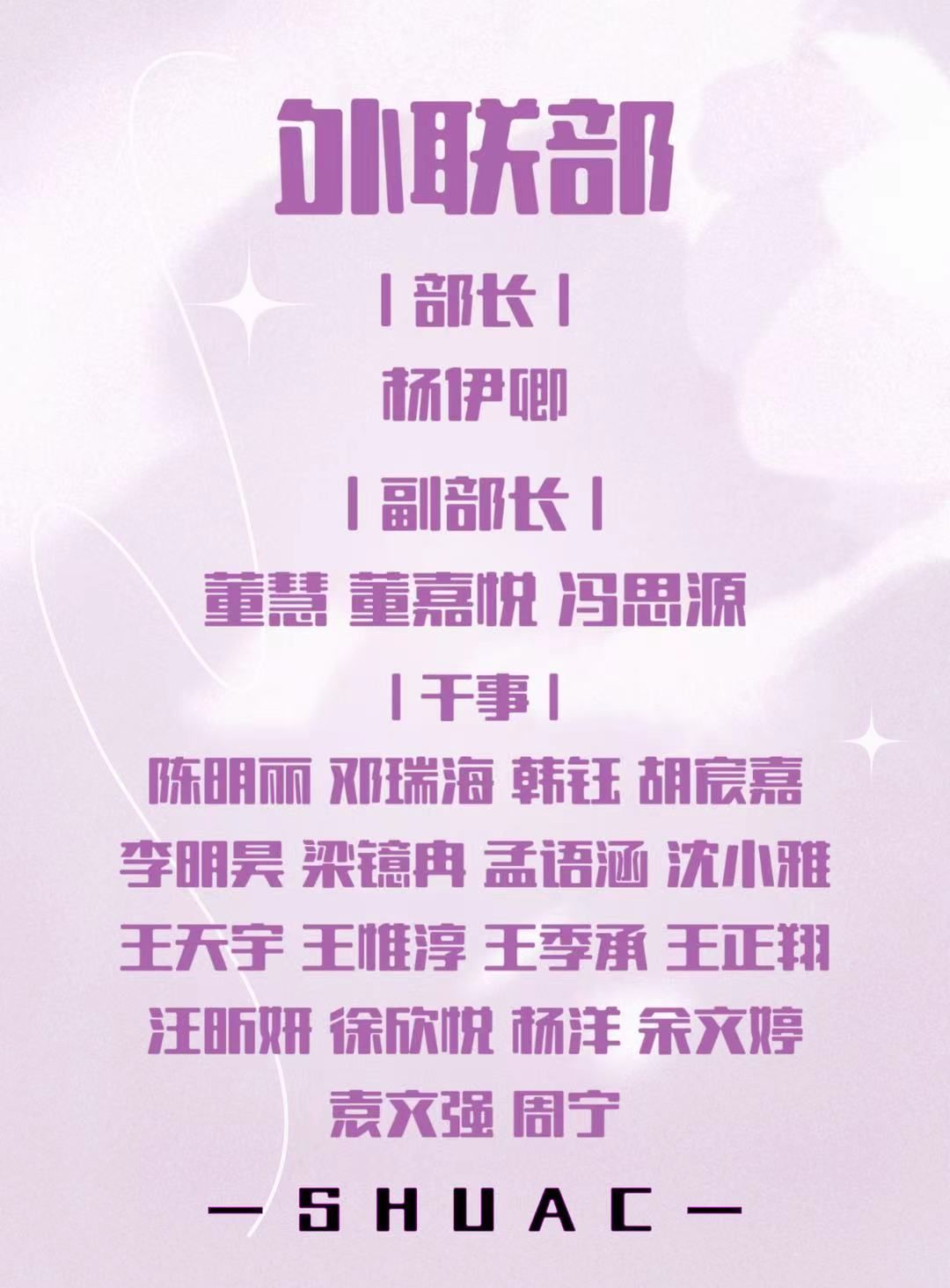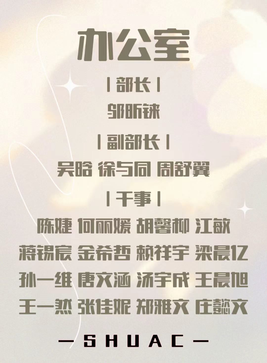 SHUAC人,希望你们在接下来的一年中,能够在社团中心这个大家庭中收获满满的爱,锻炼能力,提升自我。同心社团,让我们新的一年携手共进。